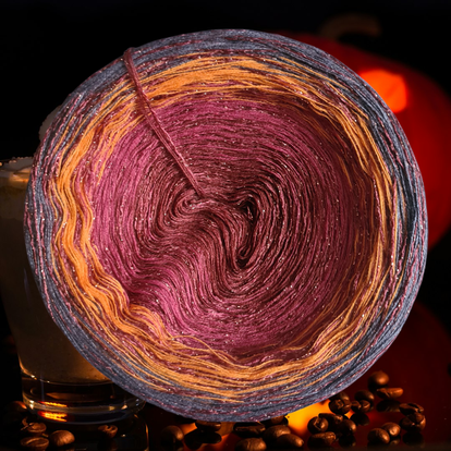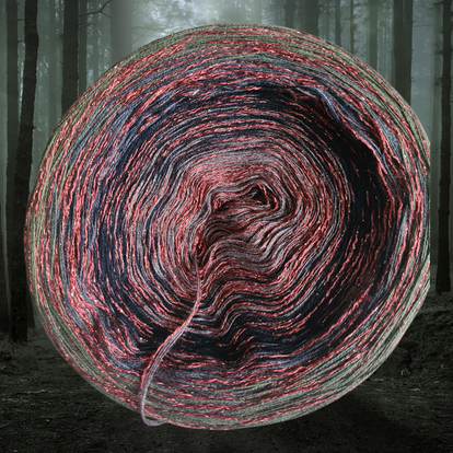 Während sich das Garn nach außen windet, mischt sich ein silbriges Grau dazu, das an aufziehende Nebelschleier erinnert. Schließlich umhüllt ein tiefes, samtiges Schwarz den gesamten Farbverlauf – wie die einbrechende Nacht, die alles in einen mystischen Schleier taucht.
