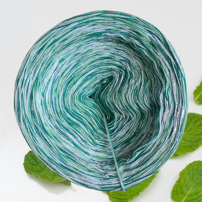Ein sanfter Mint-Ton mit eisigem Schimmer, durchzogen von feinen, silbernen Glanzfäden, die dezent funkeln und dem Garn eine elegante Note verleihen.